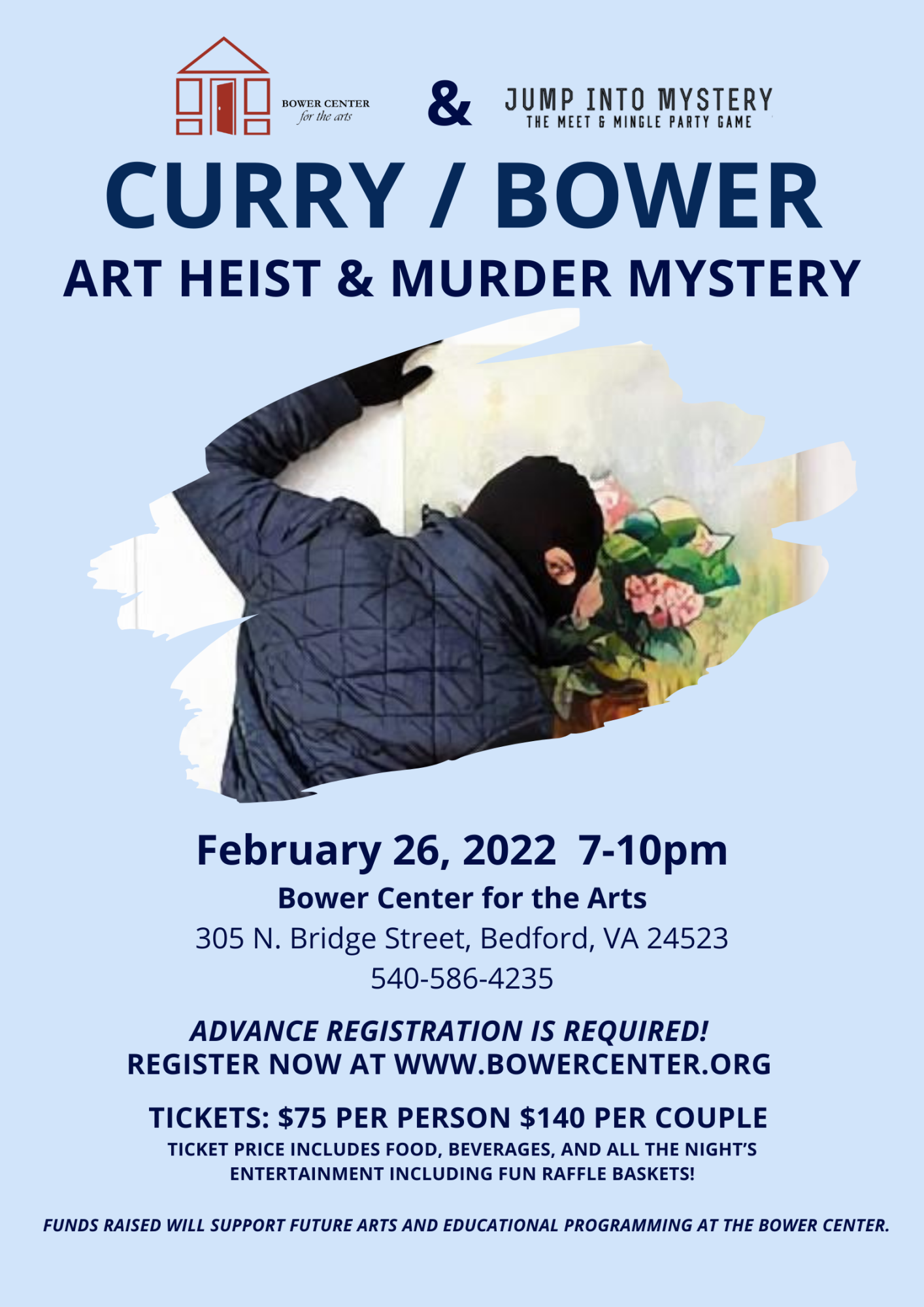 Join Bower Center for the Arts and Jump into Mystery as we offer a unique experience! Each guest will enter another world and become a character when they enter the Bower Center; roles will be supplied in advance, and you will sustain it for the length of the event. This fun, interactive event will have you asking questions of each of the other guests, searching for clues, and buying or selling information using fake money. In the end, you will decide who committed a murder and Art Heist crime, the motive, and the method.