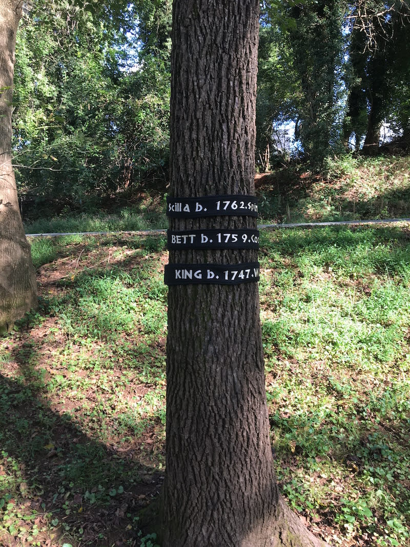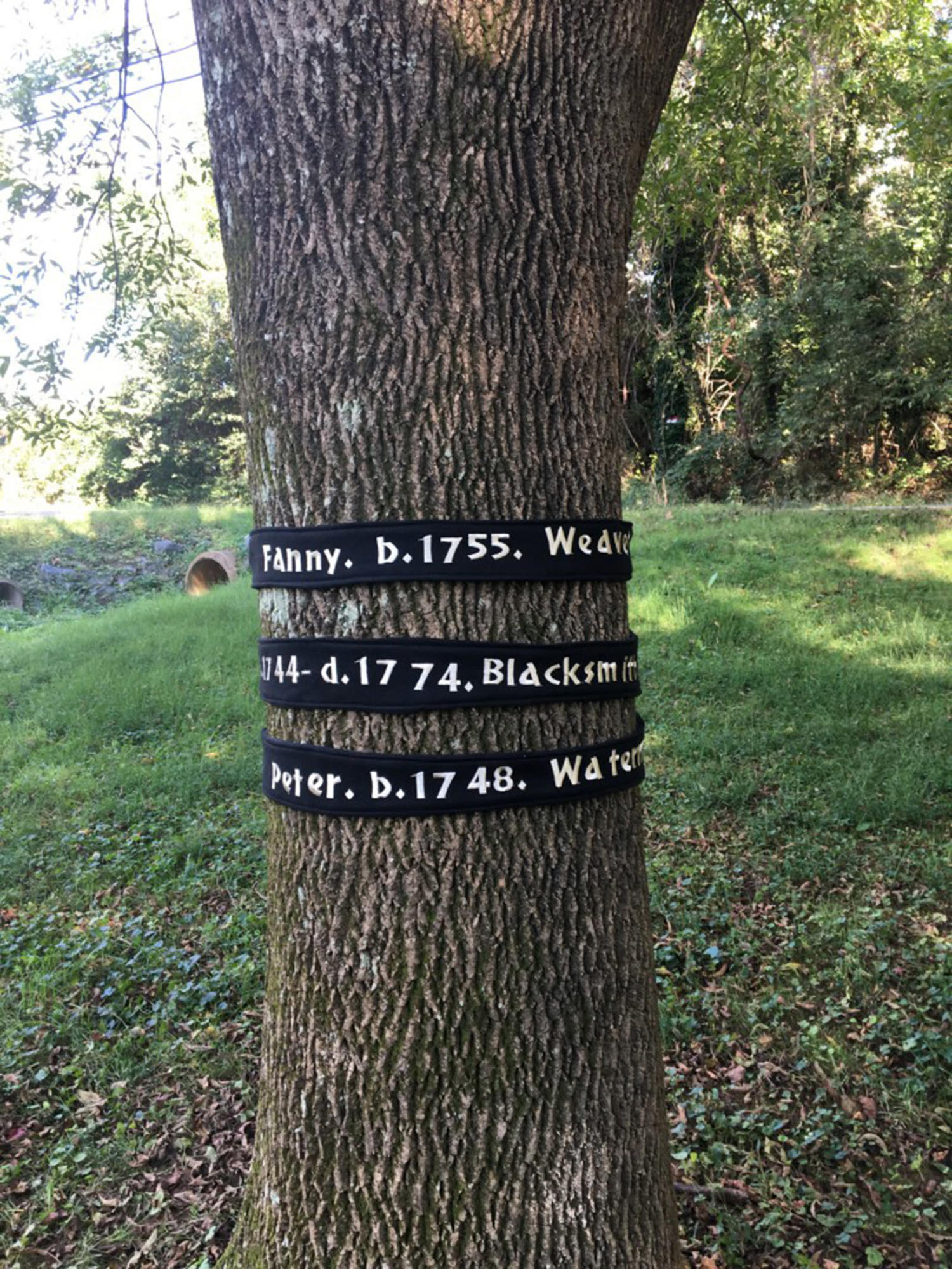 Her artwork entitled, In Memoriam: For Those Who Labored for His Happiness was made in 2018 and consists of seven “treebands.” These felt bands were wrapped around thick-barked trees in a grove along the Rivanna River (aka “Jefferson’s River”) in Charlottesville, VA. They document a few of the many enslaved people at Monticello—the third President’s home and working plantation. Each person’s name, birthdate, and occupation were embroidered into an individual length of black fabric. Reminiscent of traditional armbands, these physical reminders memorialize those forgotten and invisible laborers who either produced goods transported down the Rivanna, or watermen who worked beside its banks, or stone masons whose extant markings exist at dams along various points of the waterway.