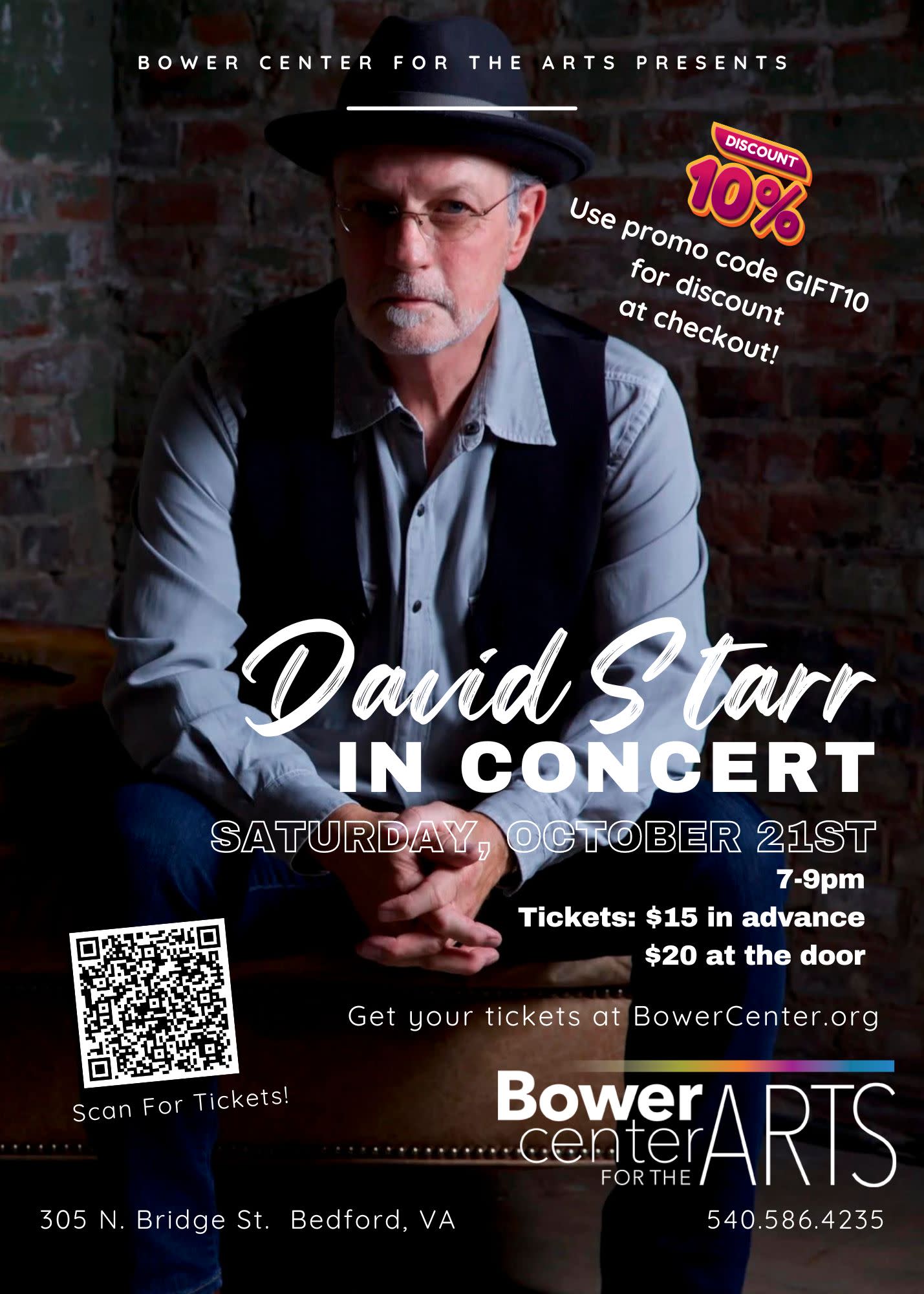 Join us on Saturday, October 21 for David Starr in concert with special guest, Erik Stucky!  Doors open at 6:30 PM, concert begins at 7 PM.  “His music is authentic, his songs are honest; full of emotion and truth. A voice you will never forget.” - John Oates  Saturday, October 21 from 7-9pm