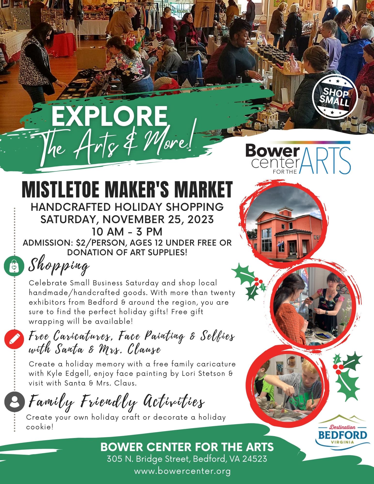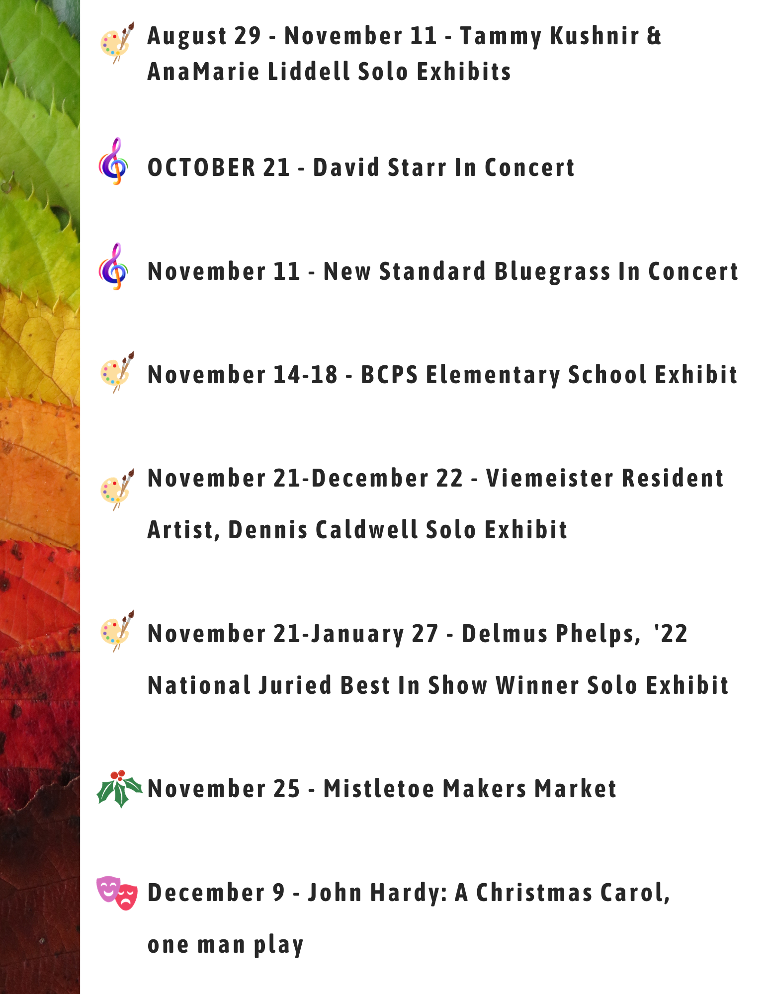 Upcoming: David Starr In ConcertCurrent Exhibits by AnaMarie Liddell & Tammy KushnirMistletoe Makers Market: Vendor Spotlight!Upcoming Class Schedule & RegistrationUpcoming Concerts, Events, & ExhibitsDonate & Volunteer Today! |