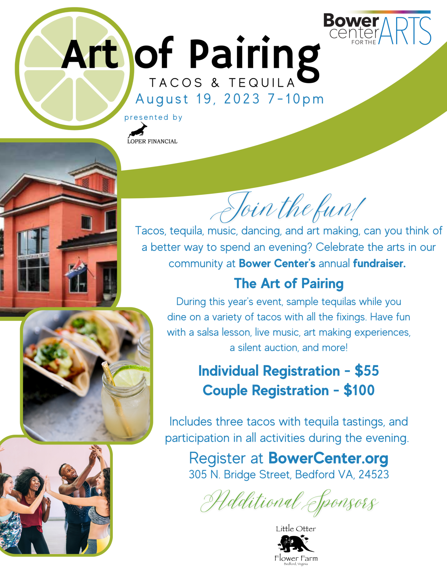 The Bower Center for the Arts is excited to announce a new annual fundraising event for adults to enjoy an evening out while supporting the Bower Center’s mission and programs. The Art of Pairing – Tacos & Tequila, presented by Loper Financial, will be held on Saturday, August 19 from 7 PM – 10 PM in the beautiful & historic Bower Center for the Arts.
