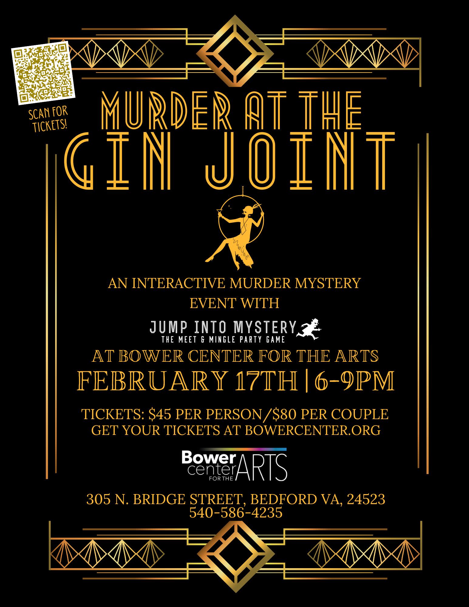 A Murder at the Gin Joint! This is an interactive murder mystery event where you will play a character, solve clues, and interrogate all of the suspects. You will laugh, talk, eat, and drink. In the end you will decide who committed the crime using your detective skills!