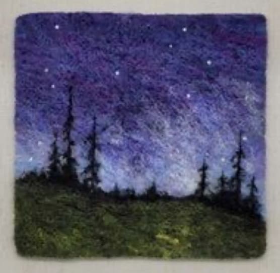 This needle felt painting landscape features birch trees on a 5x7 felt canvas, designed to be straightforward yet suitable for more advanced students. This is a guided class to go over each step for you to successfully paint with felt on your own. All necessary supplies are included, and a frame will be provided to enhance the finished artwork.