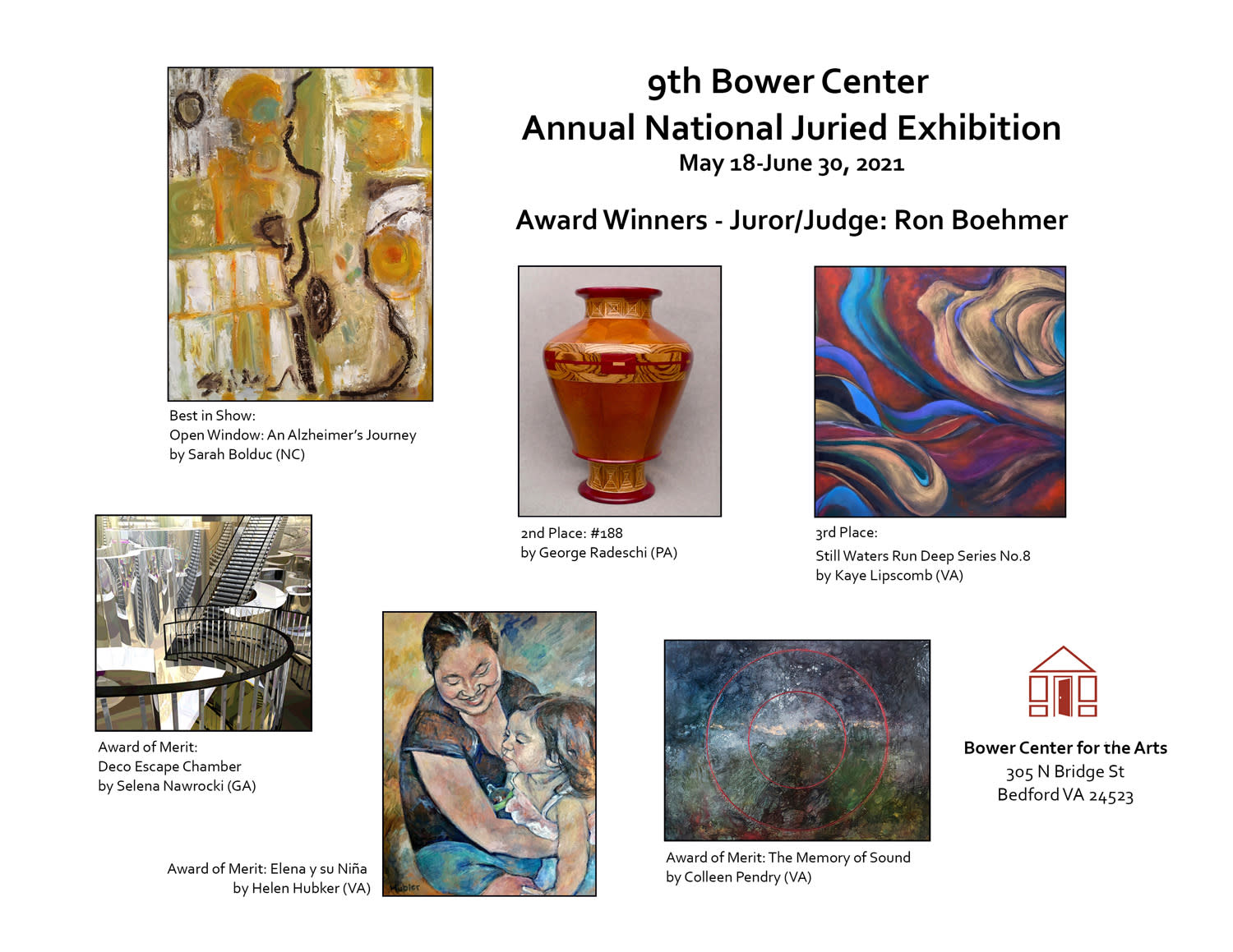 This exhibition is open to all artists over the age of 18. All entries must be original works (no reproductions) and created by the artists within the past three years and not been in a previous juried exhibit at Bower Center. 2-D art must be in sturdy frames or gallery-wrapped and wired for hanging (no saw-tooth hangers or use of loops embedded in cardboard backing). Photographs should be mounted, if rippling shows, they may be rejected.