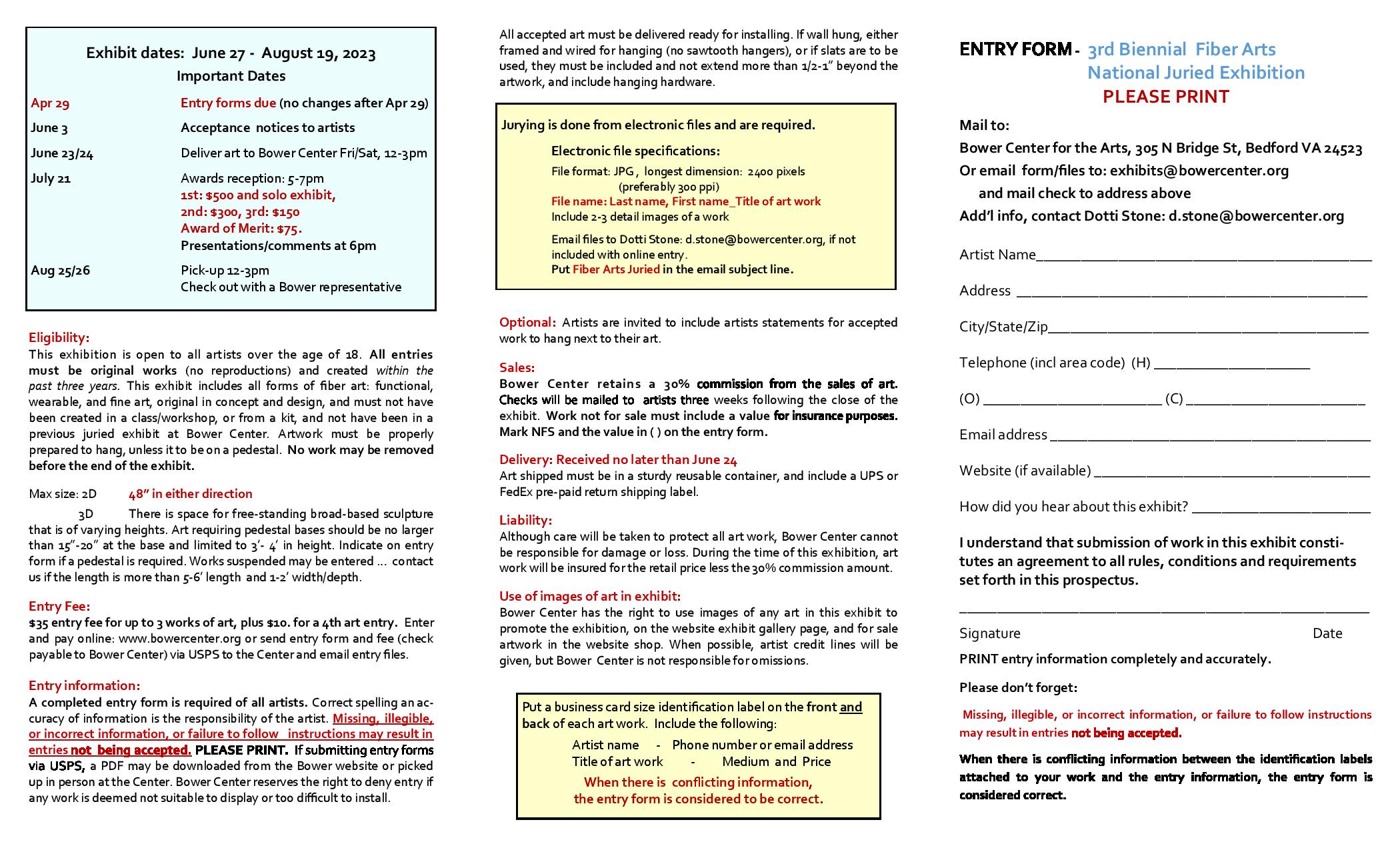 Entry Fee: $35 entry fee for up to 3 works of art, plus $10 for a 4th art entry. You may enter online by clicking the Registration button on this page or downloading the paper entry and mailing it with check made payable to Bower Center to 305 N. Bridge Street, Bedford, VA 24523.