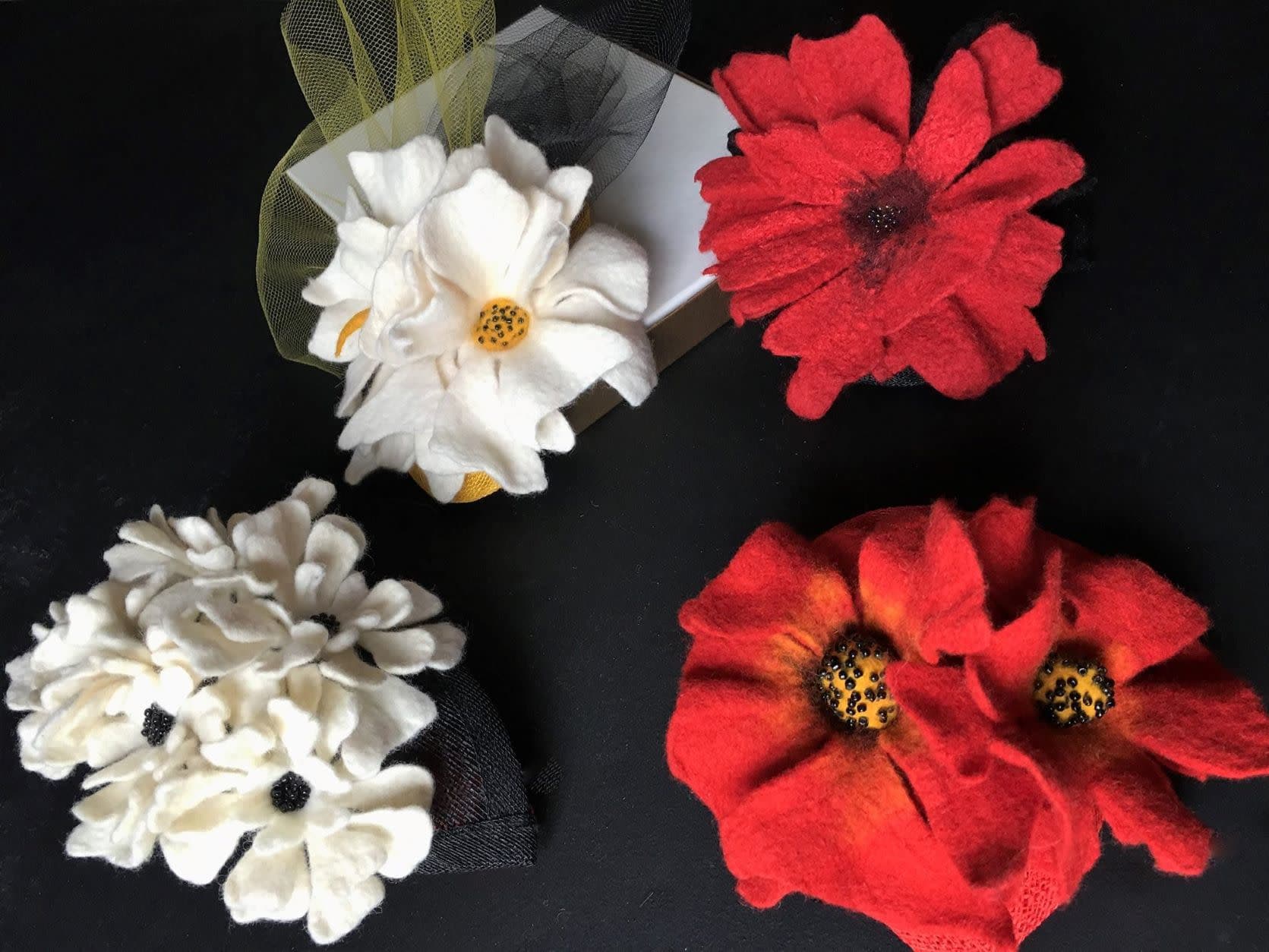 In this fun hands-on workshop, we will transform Merino wool top into beautiful felt flowers using just our hands, imagination, and a little soap and water. This magical process is called wet felting. We will attach beads and a pin back so that you may adorn a coat or hat. Each participant will leave with at least two. To participate in this class, please bring 2 bath sized towels and a fine needle for beading.