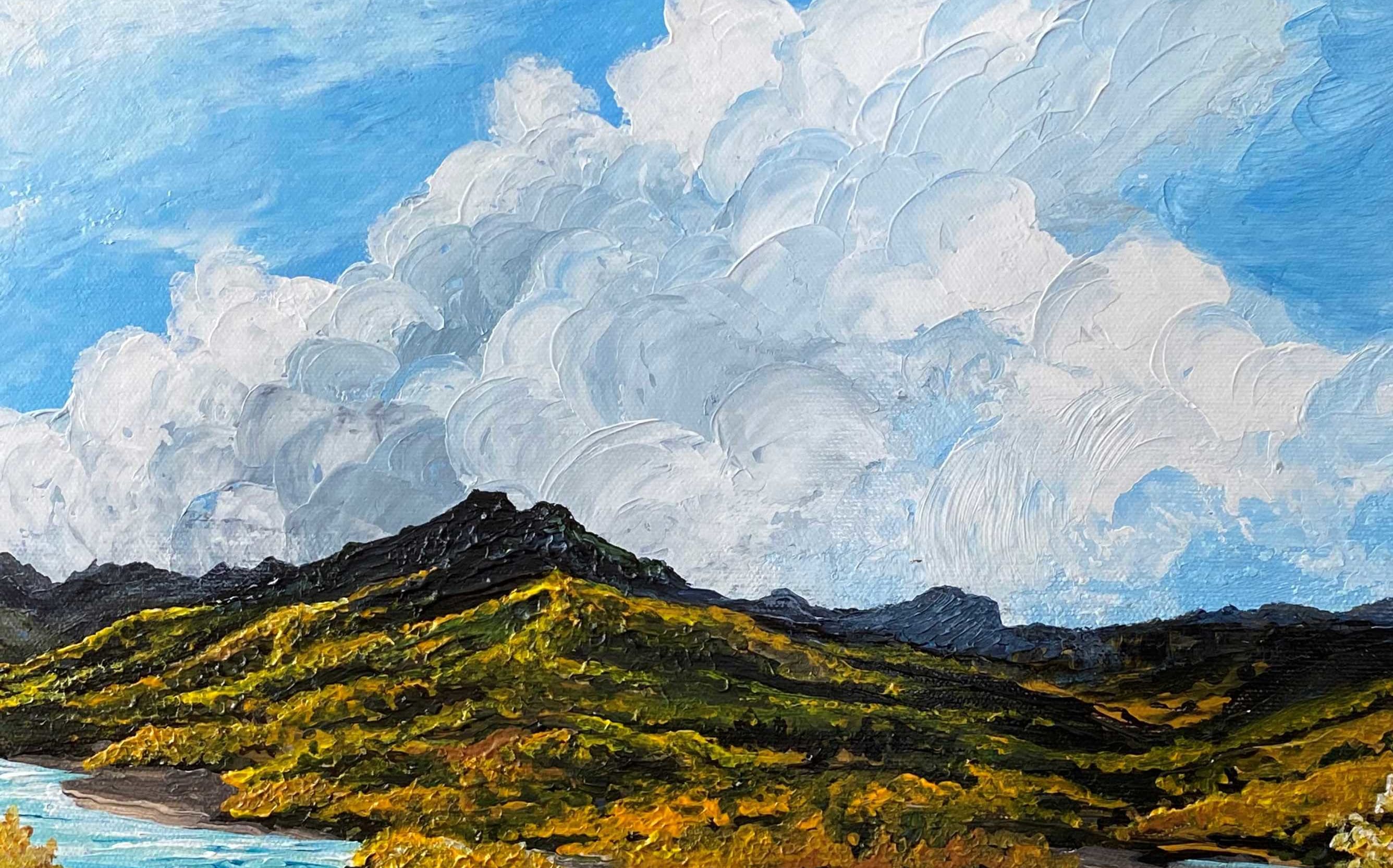 Clear blue vistas, breathtaking sunrises and sunsets, angry storms and the endless cloud formations that form overhead can be challenging to portray in 2D art. Spend an afternoon learning techniques to further develop your aerial painting skills. We will be working in acrylic on multiple canvases with brush and pallet knife.