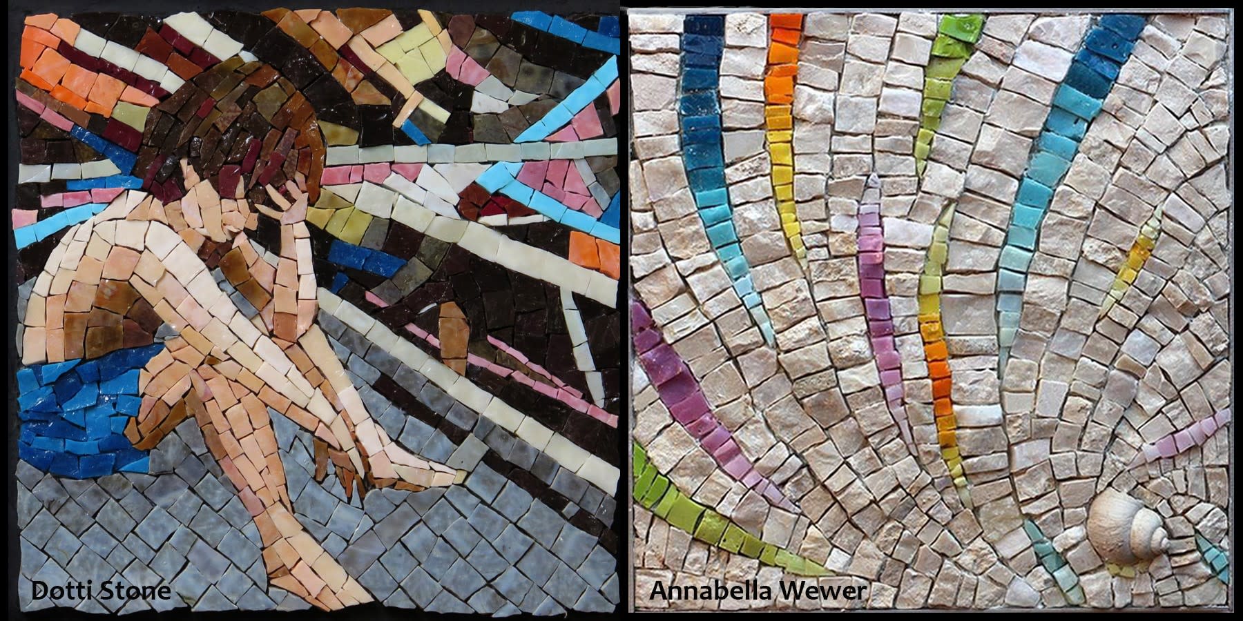 Stone took up mosaics in the early 2000s while in Northern VA. She open a studio at Bower Center for the Arts in 2009 after leaving the DC area. Stone creates fine art panels and sculptural works, exhibits her work, and teaches mosaics classes at Bower Center.