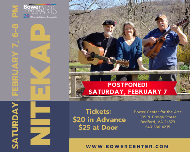 Ken Horne and Allison Johnson have been joined by Paul Brockman to form NiteKap, a trio of local Bedford musicians who perform an eclectic mix of American folk music. Their stage show spans several centuries and many genres of American folk music. From contemporary americana to sixteenth century Childe ballads, from classic blues to country music standards (and some that ought to be), NiteKAP offers a wide variety of musical styles and arrangements. Allisons' sparkling lead vocals and intricate harmonies blend perfectly with Ken's rich baritone leads and Paul’s tenor accompaniment. Accompanied by Ken on finger style guitar and six string banjo and Paul on fiddle and Bazouki, NiteKap creates an evening of music that is entertaining, inspiring, and always a whole lot of fun.
