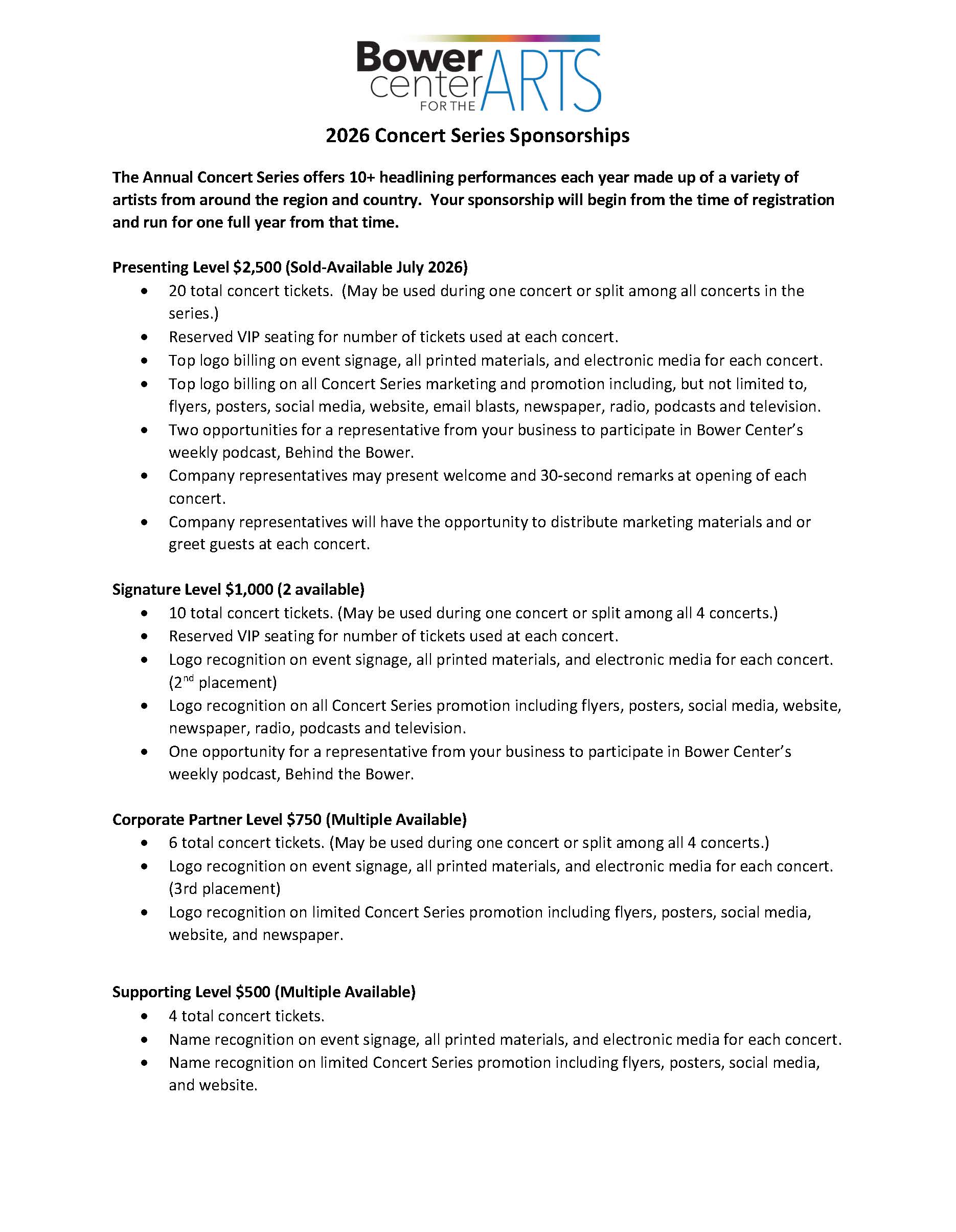 Please review the Concert Series sponsor levels and benefits attached below.  Your annual sponsorship will start with the first concert after your registration is received and run for one year.  Please contact Susan Martin, Director of Development & Marketing at s.martin@bowercenter.org with any questions or to review the benefits. Please click HERE to review the Concert Series Sponsor Levels with Benefits!