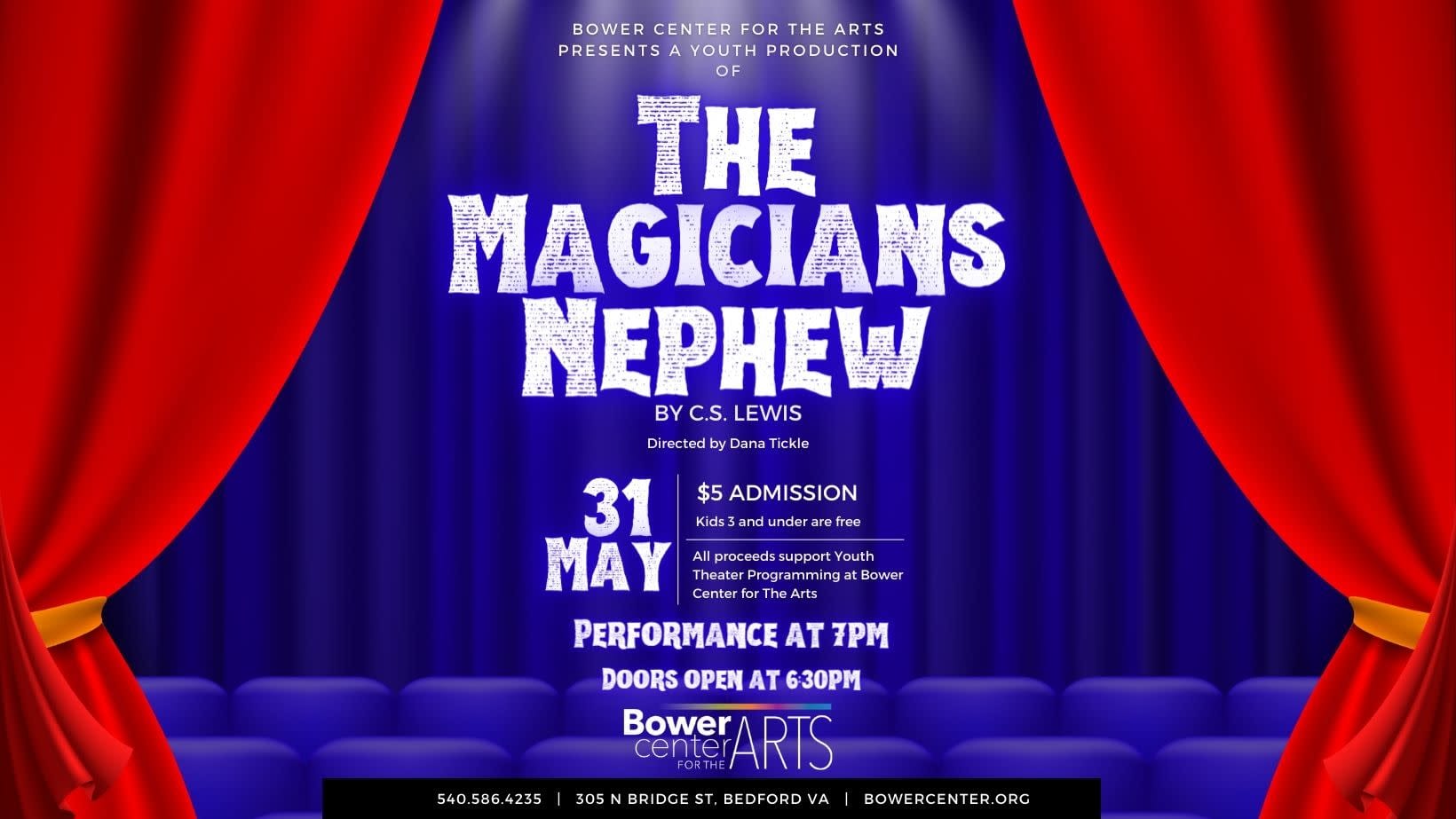 Join us for our Youth Theater Program's rendition of The Magician's Nephew by C.S. Lewis. Directed by Dana Tickle. Performance begins at 7pm, Doors open at 6:30pm ADMISSION: $5, Children 12 and under are FREE with a paying adult. All proceeds go to support Youth Theater Programming at Bower Center for The Arts